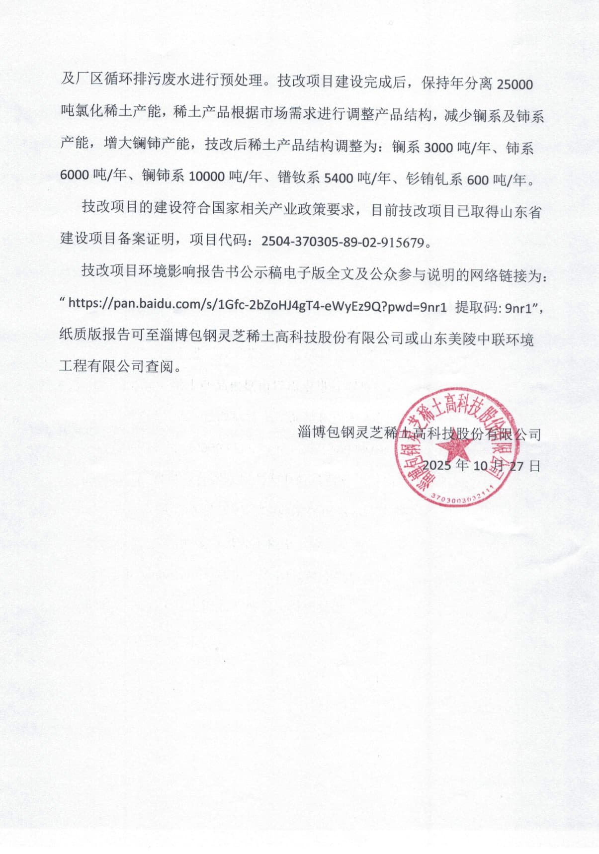 淄博包鋼靈芝稀土高科技股份有限公司25000噸/年氯化稀土產品質量和環(huán)保提升技術改造項目環(huán)境影響評價擬報批前公示